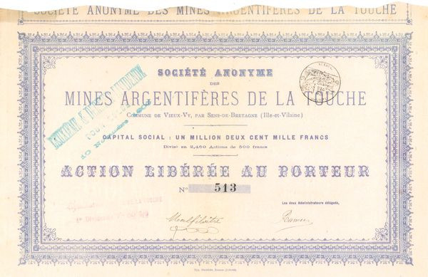 S.A. des Mines Argentifères de la Touche - Commune de Vieux-Vy par Sens-de-Bretagne (Act)