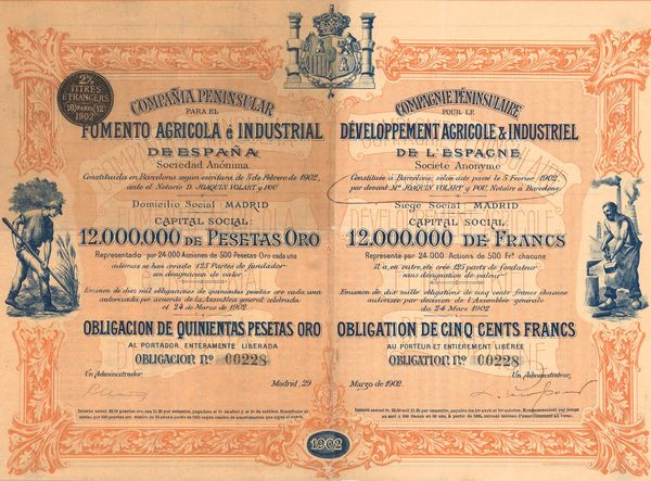 Cie Péninsulaire pour le Dévéloppement Agricole & Industriel de l'Espagne (Obl 500 F)
