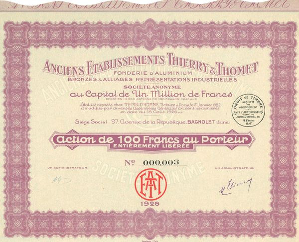 Anciens Etablissements Thierry & Thomet Fonderie d'Aluminium Bronzes & Alliages Représentations Industirelles (Act 100 F)