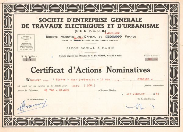 Sté d'Entreprise Générale de Travaux Electriques et d'Urbanisme (S. E. G. T. E. U. R.) (Certif Nomin)