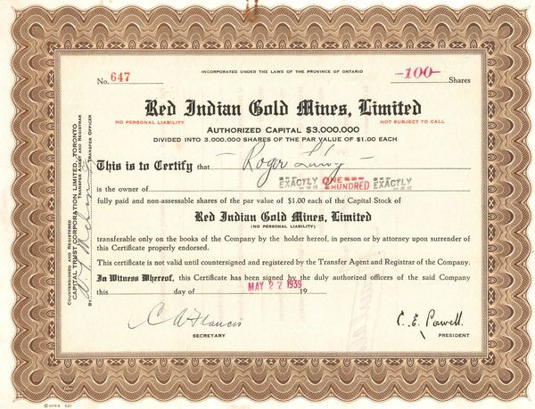 Red Indian Gold Mines Ltd (Titre 100 Shares 1$)