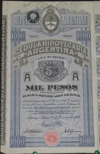 Cedula Hipotecaria Argentina 5 % - 1000 pesos