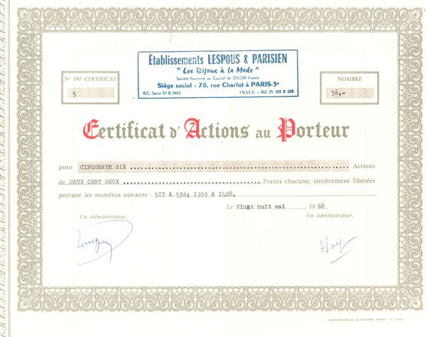 Ets Lespous & Parisien "Les Bijoux à la Mode" (Titre 56 Act 200 F)