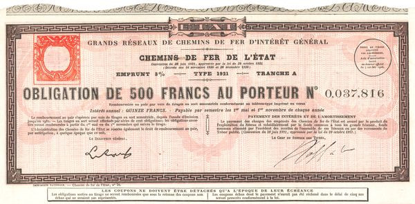 Grands Réseaux de Chemins de Fer d'Intérêt Général - Chemins de Fer de l'Etat - Emprunt 3% 1921 Tranche A (Obl 500 F 3%)