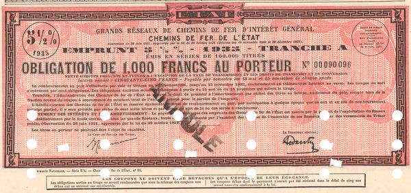 Grands Réseaux de Chemins de Fer d'Intérêt Général - Chemins de Fer de l'Etat - Emprunt 5% 1/2 - 1935 Tranche A (Obl 1000 F 5% 1