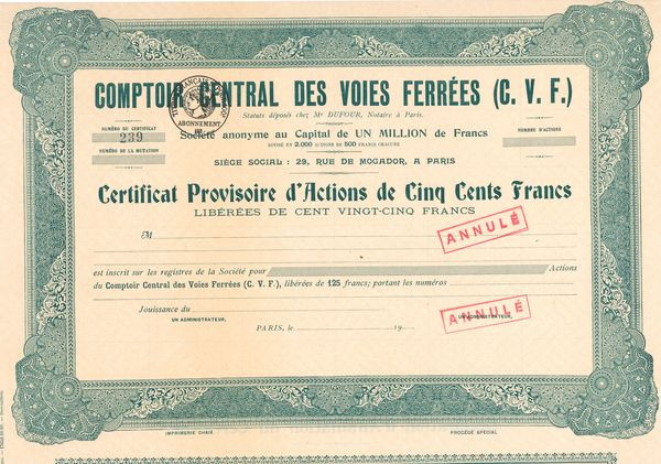 Comptoir Central des Voies Ferrées (C. V. F.) (Blanquette) (Certif Act 500 F)