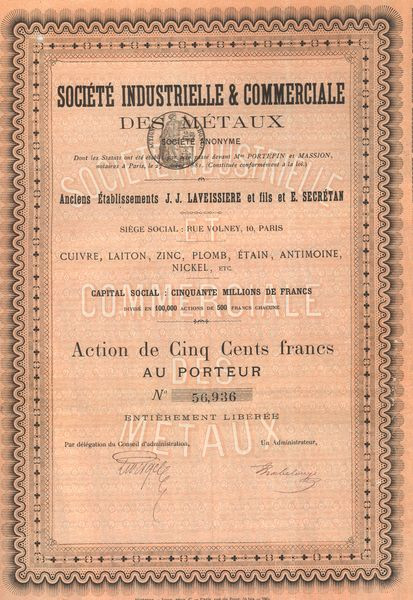 Sté Industrielle & Commerciale des Métaux - Anc Ets J.-J. Laveissière et Fils & E. Secrétan - Cuivre. Laiton. Zinc. Plomb. Etain