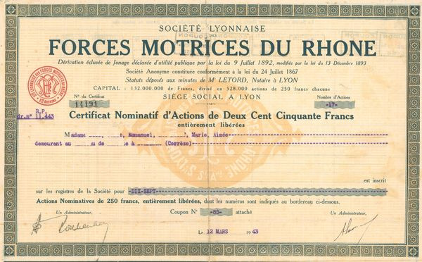 Sté Lyonnaise des Forces Motrices du Rhône (Certif nomin Obl 250 F)