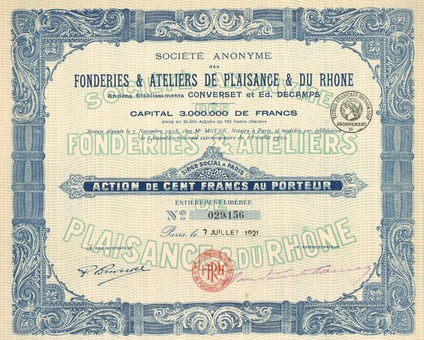S.A. des Fonderies & Ateliers de Plaisance & du Rhône Anc Ets Converset et Ed. Decamps (Act 100 F)