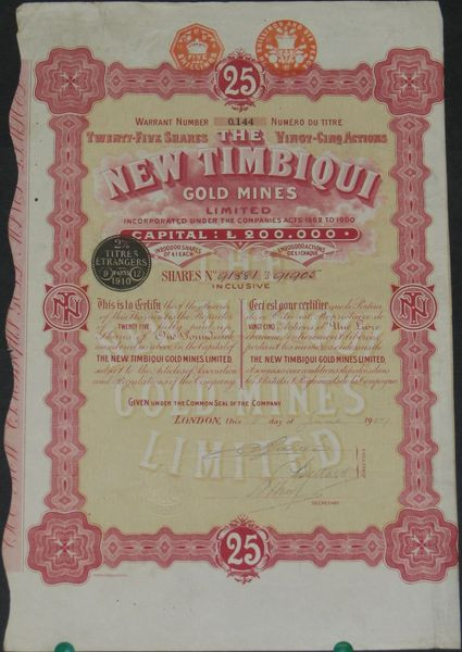 The New Timbiqui Gold Mines Ltd (Titre 25 Act 1£)