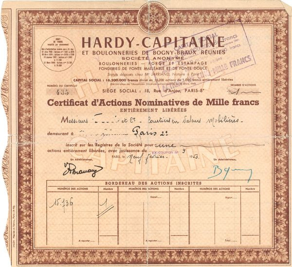 Hardy-Capitaine et Boulonneries de Bogny-Braux Réunies (Rouge)(Certif d'Act Nomin 1000 F)