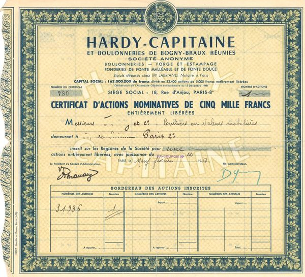 Hardy-Capitaine et Boulonneries de Bogny-Braux Réunies (Verte)(Certif d'Act Nomin 5000 F)