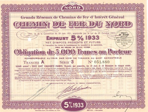 Grands réseaux de Chemins de Fer d'Intérêt Général - Chemin de Fer du Nord 5% - 1933 - (Violet)(Obl 5000 F 5%)