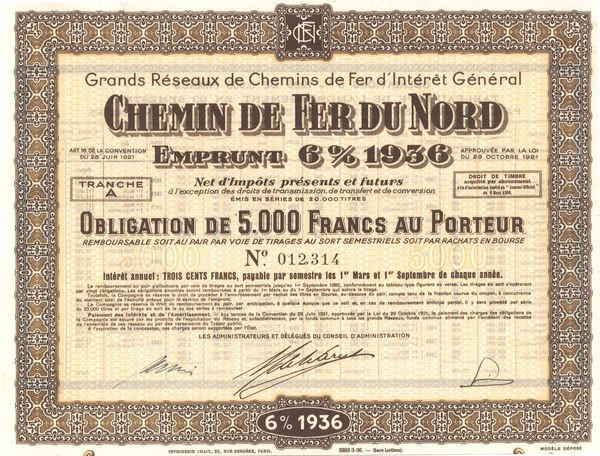 Grands réseaux de Chemins de Fer d'Intérêt Général - Chemin de Fer du Nord - Emprunt 6% 1936 (Obl 5000 F)