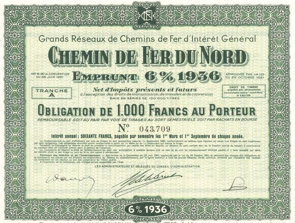 Grands réseaux de Chemins de Fer d'Intérêt Général - Chemin de Fer du Nord - Emprunt 6% 1936 (Obl 1000 F)