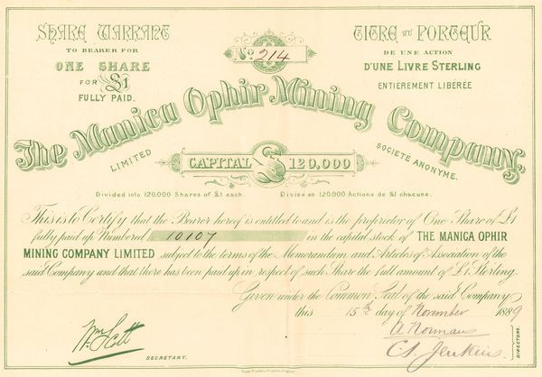The Manica Ophir Mining Cy Ltd (Titre 01 Act 1 $)