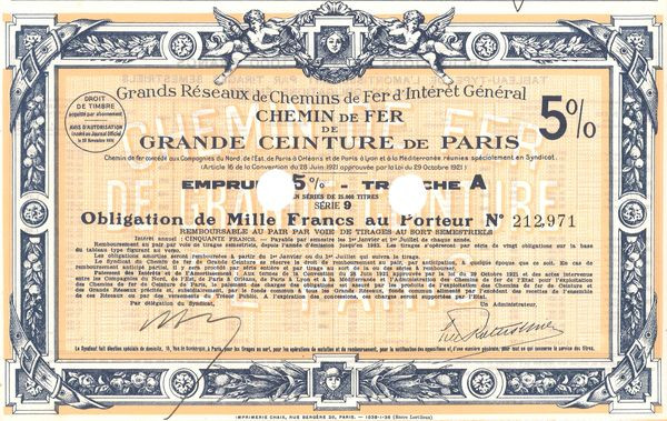 Grands Réseaux de Chemins de Fer d'Intérêt Général - Chemin de Fer de Grande Ceinture de Paris 5% Tranche A (Obl 5% 1000 F)
