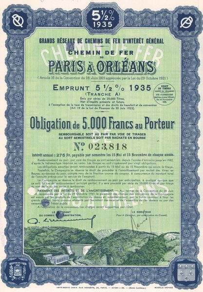 Grands Réseaux de Chemins de Fer d'Intérêt Général - Chemins de Fer de Paris à Orléans - Emprunt 5 1/2 % 1935 Tranche A (Obl 500