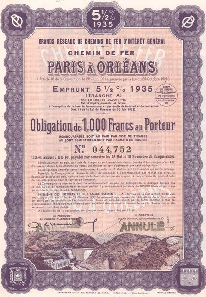 Grands Réseaux de Chemins de Fer d'Intérêt Général - Chemins de Fer de Paris à Orléans - Emprunt 5 1/2 % 1935 Tranche A (Obl 100