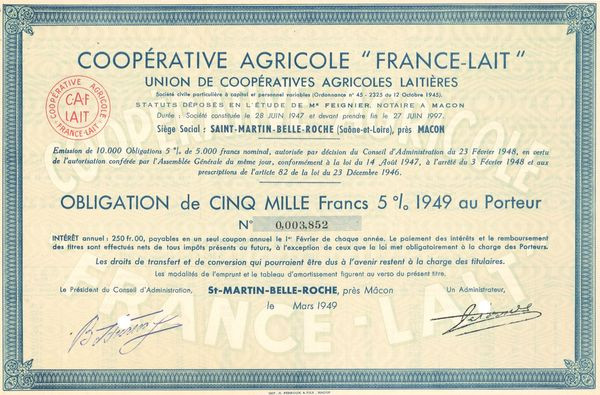 Coopérative Agricole "France-Lait" Union de Coopératives Agricoles Laitières (Obl 5000 F 5% 1949)