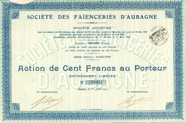 Sté des Faïenceries d'Aubagne - 1913 (Act 100 F)