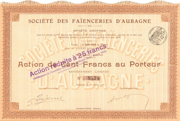Sté des Faïenceries d'Aubagne - 1908 (Act 100 F réduite à 25 F)