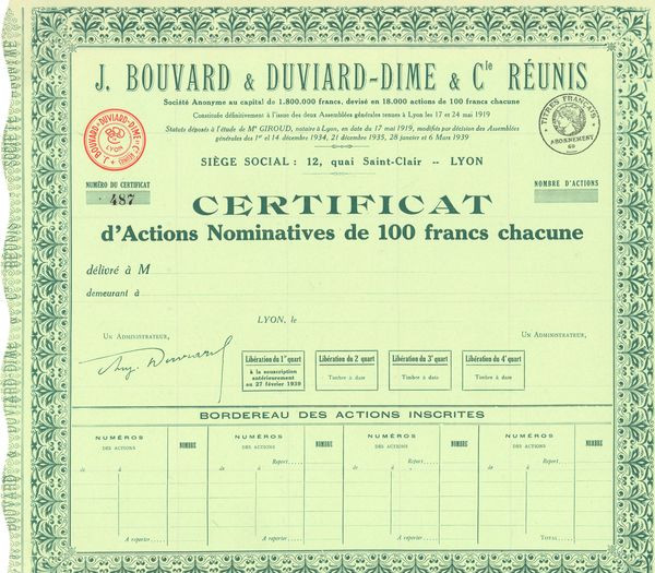 J. Bouvard & Duviard-Dime & Cie Réunis (Blanquette)(Certif Act Nomin 100 F)
