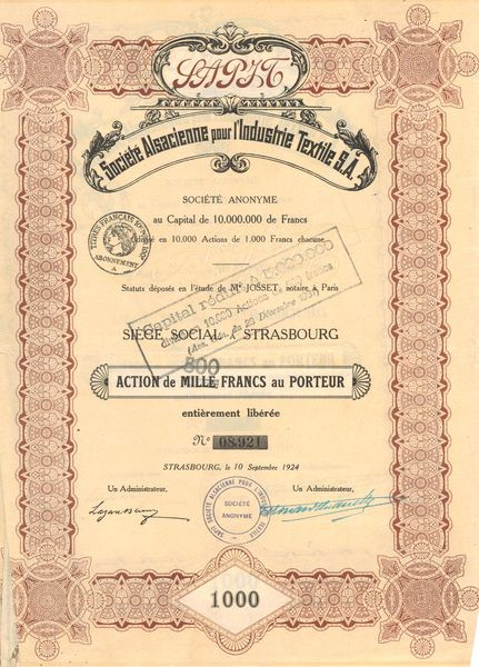 SAPIT Sté Alsacienne pour l'Industrie Textile (Act 1000 F)