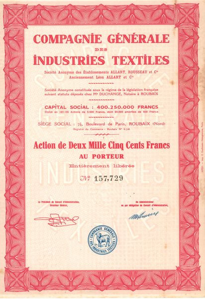 Cie Gale des Industries Textiles - S.A. des Ets ALLART. ROUSSEAU & Cie - Anc Léon ALLART et Cie (Act 2500 F)