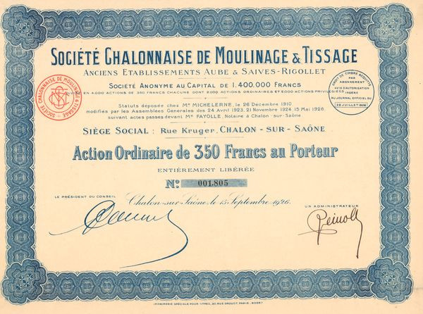 Sté Chalonnaise de Moulinage & Tissage - Anc Ets Aube & Saives-Rigollet (Act O 350 F)