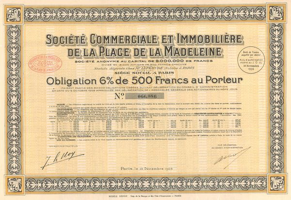 Sté Commerciale et Immobilière de la Place de la Madeleine (Obl 6% 500 F)
