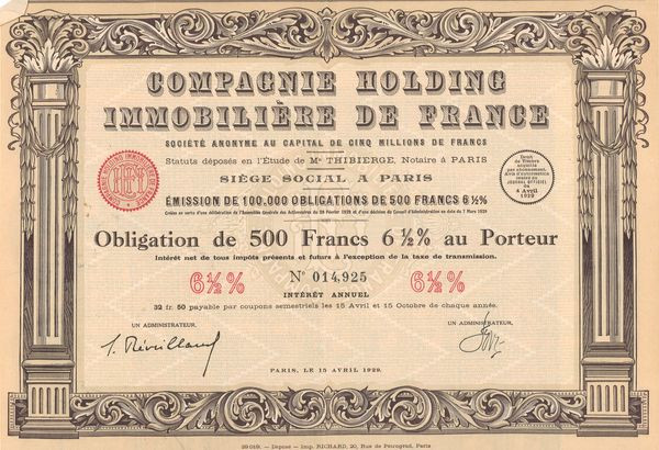 Cie Holding Immobilière de France (Obl 500 F 6% 1/2)