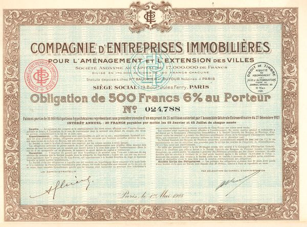 Cie d'Entreprises Immobilière pour l'Aménagement et l'Extention des Villes (Obl 500 F 6%)
