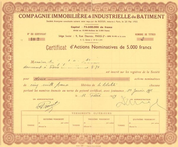 Cie Immobilière & Industrielle du Bâtiment (Certif d'Act Nomin 5000 F)