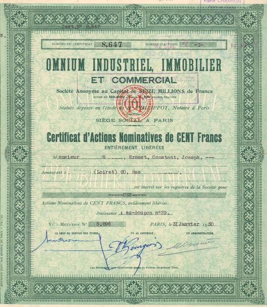 Omnium Industriel. Immobilier et Commercial (Certif Act Nomin 100 F)