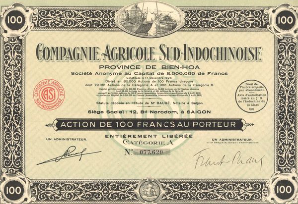 Cie Agricole Sud-Indochinoise - Province de Bien-Hoa (Act A 100F)