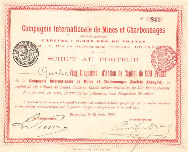 Cie Internationale de Mines et Charbonnages - 1903 - Rouge (04/25eme Act Ordin)