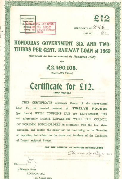 Honduras Government Six and Twothids per Cent Railway Loan of 1869 (Act 300 F)