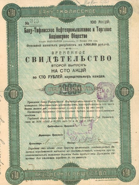 Baku-Tiflis Oil Production and Trading Co (Titre 100 Roubles)