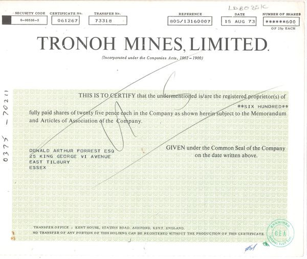 Tronoh Mines Ltd (Titre 600 Act 25p Each)