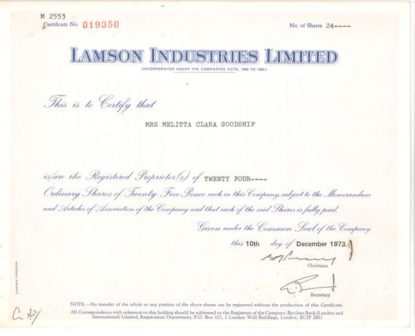 Lamson Industries Ltd (Titre 24 Act 25p £)
