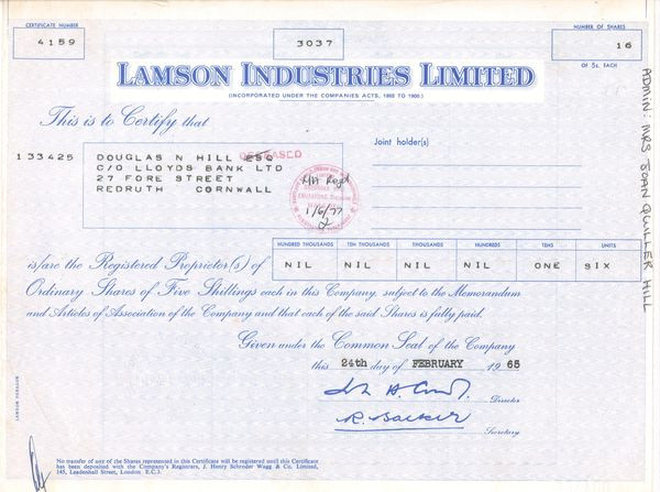 Lamson Industries Ltd (Titre 16 Act 5s £)