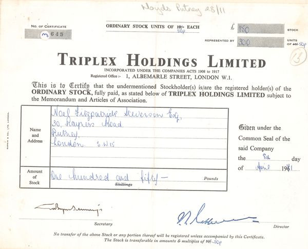 Triplex Holdings Ltd (Titre 300 Act 50p £)