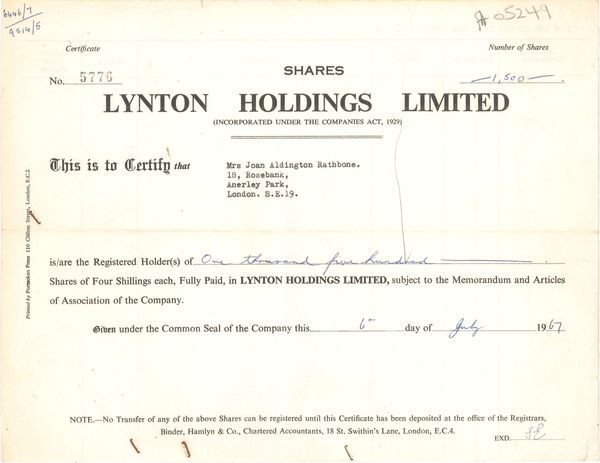 Lynton Holdings Ltd (Titre 1500 Act 4s £)