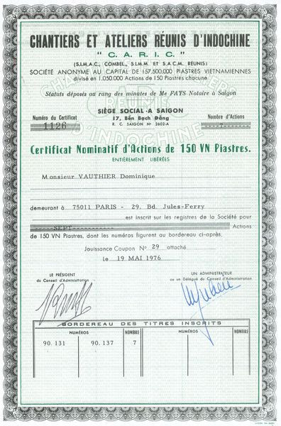 "C. A. R. I. C." Chantiers et Ateliers Réunis d'Indochine (Certif Nomin Act 150 VN Piastres)