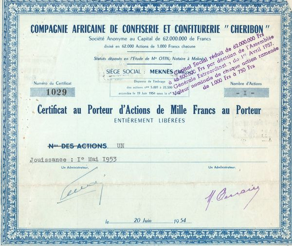 Cie Africaine de Confiserie et Confiturerie "Cheribon" (Certif Nomin de 1000F)